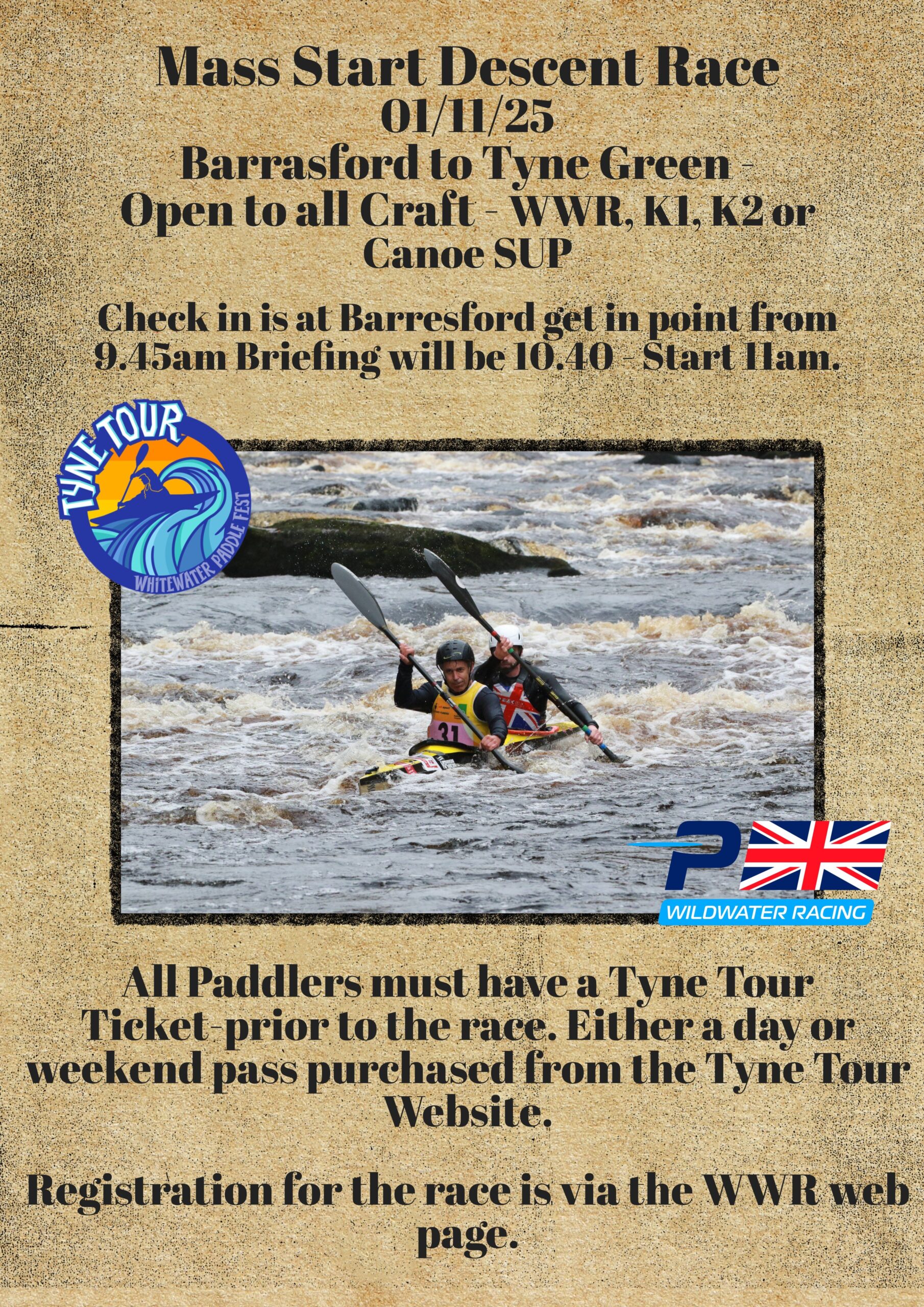 North Tyne , United KingdomRegion: North East Type: Regional Format: Mass Start Distance: Approx 12Km River Grade & Hazards: 2/3 Depending on river conditions Suitable for Novice: No Safety Cover: Yes Safety Officer: Rob Cunnington Start: Barresford - Approx 150 meters above rapids. Finish: Hexham Canoe Club off Tyne Green Hexham - Finish river right. Race Start: 11.00 Check-in…