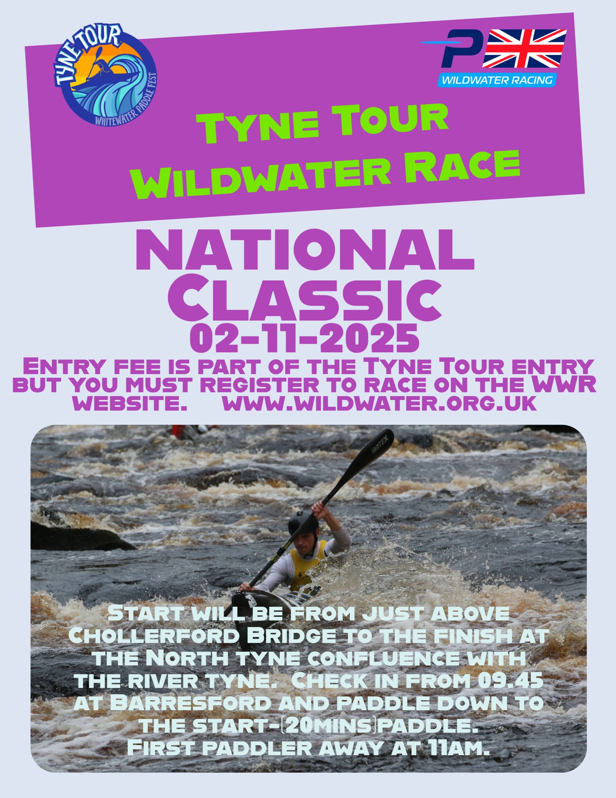 North Tyne , United KingdomRegion: North East Type: National Format: Classic Distance: 5.5km Approx River Grade & Hazards: 2/3 Depending on river conditions Suitable for Novice: No Safety Cover: Yes Safety Officer: Rob Cunnington Start: Collerford Bridge. - River left before left bridge arch. Finish: North Tyne Confluence with the River Tyne Race Start: 11am Check-in Time: From 9.45…