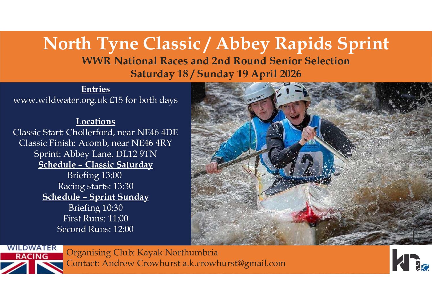 Saturday April 18th 2026 - North Tyne Classic Type: National Format: Classic Distance: 6.7 km River Grade & Hazards: Grade 3 Suitable for Novice: No Safety Cover: No Safety Officer: Cameron Duffield Start: NE46 4DE Finish: NE46 4RY Race Start: 13:30 Check-in Time: From 09:00 Briefing Time: 13:00 Sunday April 19th 2026 - Abbey Rapids…